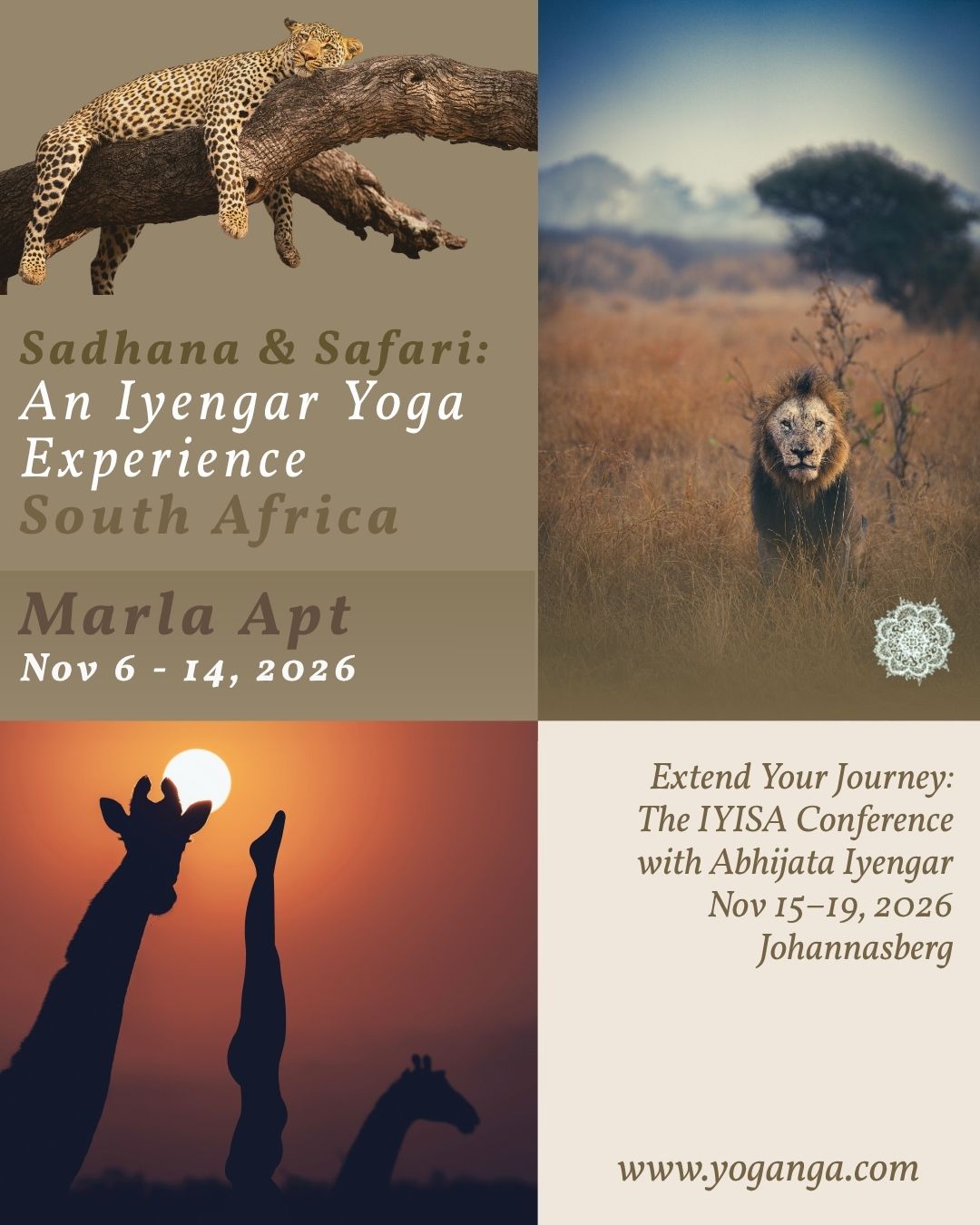 Workshops, Retreats, & In-Person Weekly In-Studio Classes Intermediate: Fridays 10-11:30am All Levels: Saturdays 10-11:15am Specific Needs: Fridays 12-1:30pm This semi-private class is designed for students with injuries or conditions that require more individualized attention than a general class can provide. Each participant follows a personalized sequence tailored to their needs. No drop-in’s. Registration: Iyengar Yoga Institute of Los Angeles Retreat in Helena, MT June 29-July 5 Feathered Pipe Ranch Retreat in Sonoma, CA October 2-4 Co-taught with Elise Miller at Westerbeke Ranch Learn more Workshop in Palo Alto, CA October 9-11 California Yoga Center Sadhana & Safari in South Africa November 6-14 Find more info and indicate your interest to join here: Safari Info Online Workshop with Japanese Translation Register through Iyengar Yoga Utsunomiya Japan Standard Time: Saturdays & Sundays: 9-11am (GMT+9) April 25-26 May 16-17 June 20-21 September 26-27